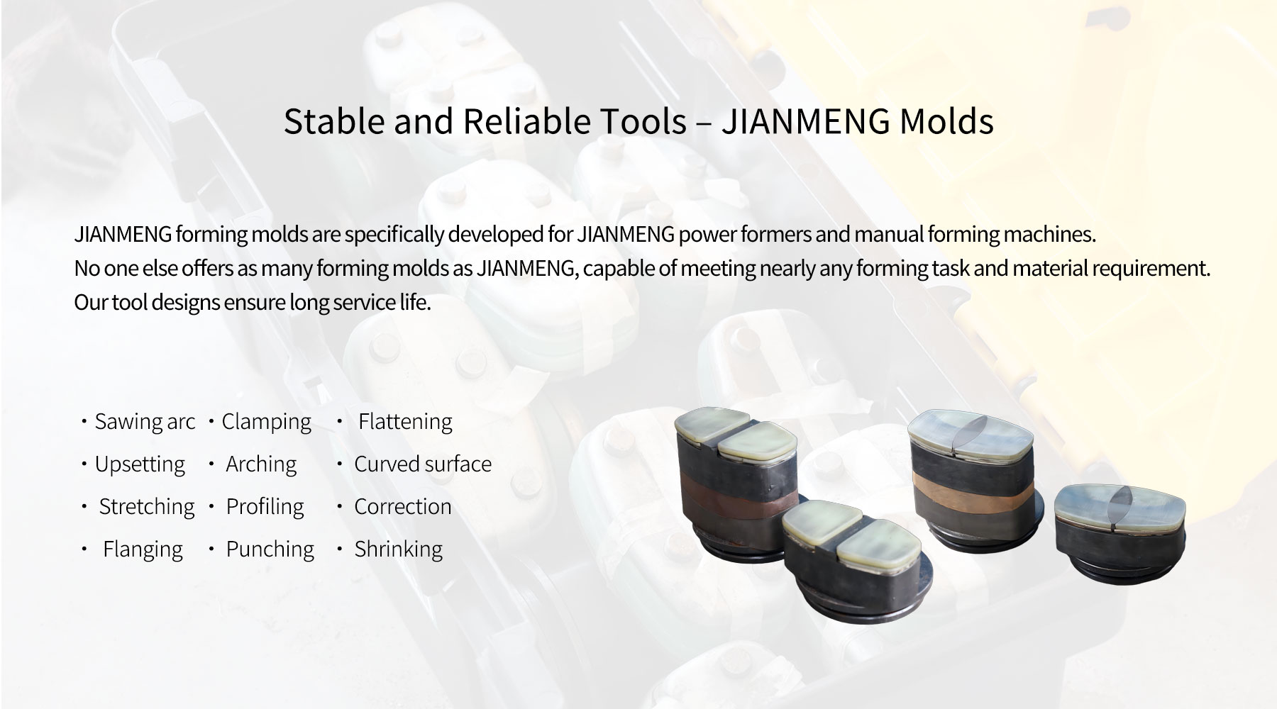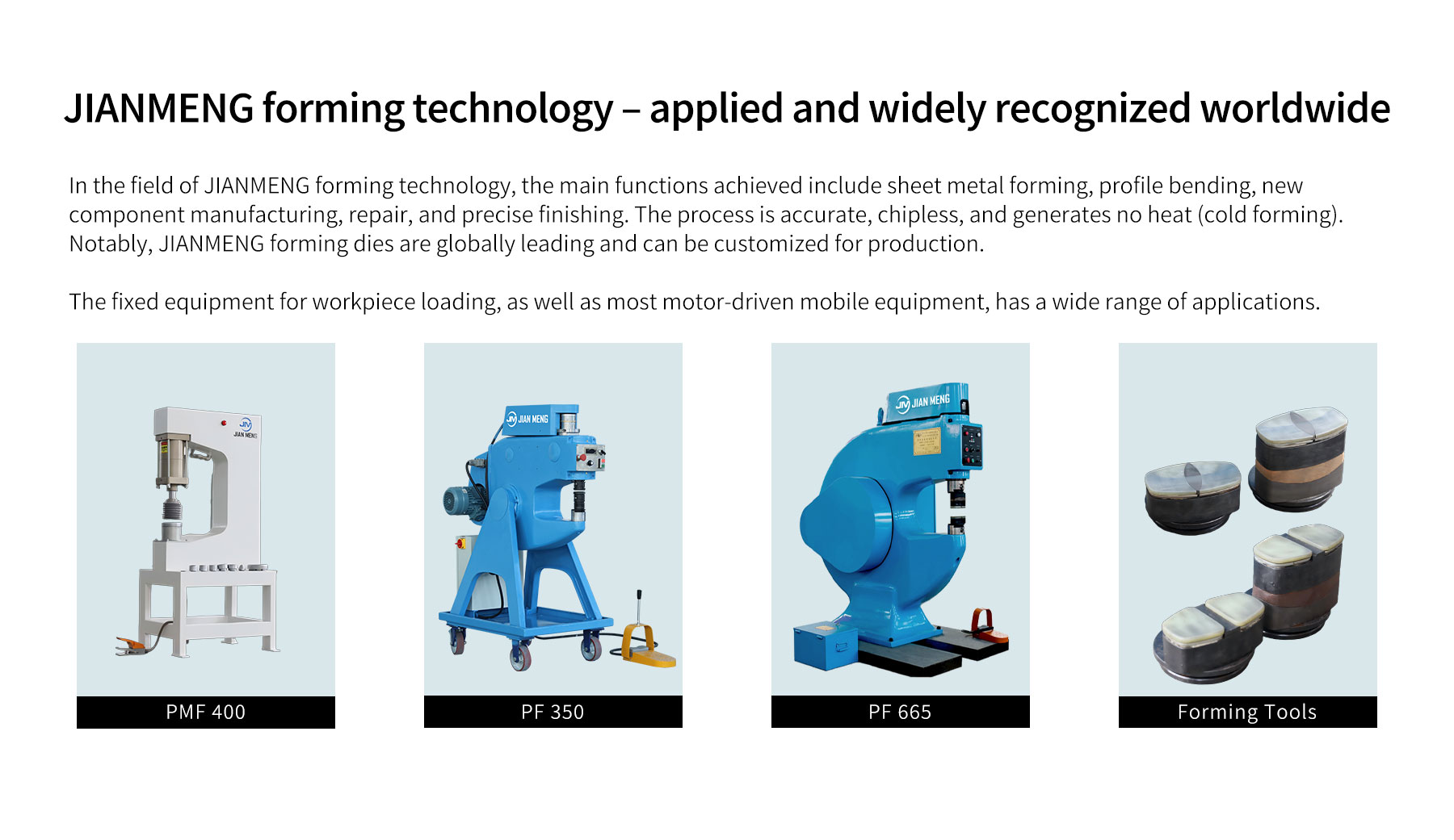 Jianmeng -tekniikka mahdollistaa metallilevyjen ja profiilien tarkan, siruttoman kylmän muodostumisen minimaalisella melulla. Kraftformer -muodostuskonetta voidaan käyttää taivutusprofiilien taivuttamiseen, metallilevyjen muodostamiseen, uusien osien valmistukseen sekä komponenttien korjaamiseen ja tarkkaan korjaamiseen. Kone on varustettu monilla työkaluilla, jotka voidaan asentaa ja vaihtaa muutamassa sekunnissa sopeutuakseen eri tehtäviin. Tämä älykäs Jianmeng -tekniikka on maailmanlaajuisesti johtava.